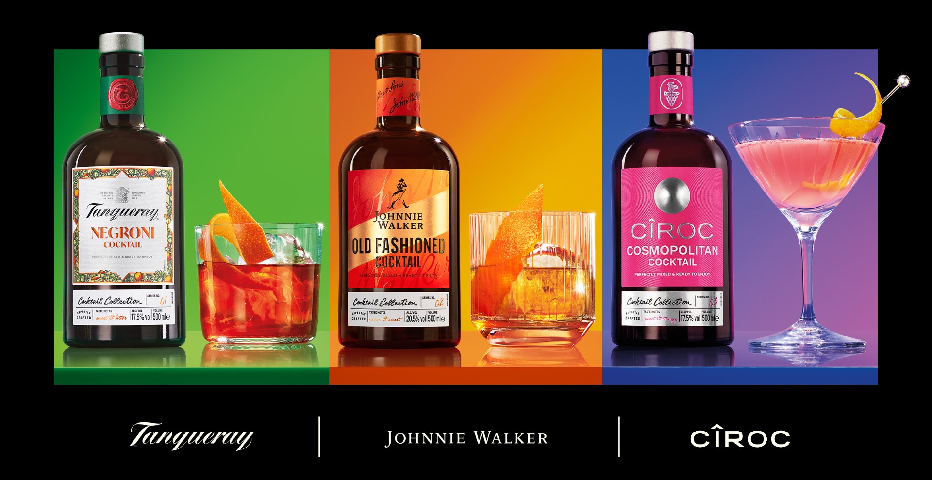 Новата забележителна гама е създадена с помощта на три от водещите марки на Diageo, формиращи основата на първокласни готови за консумация коктейли – Johnnie Walker Old Fashioned, Tanqueray Negroni и Cîroc Cosmopolitan. Всяка бутилка е налична в размер от 500 мл и съдържа количество достатъчно за няколко коктейла, които да споделите с приятели или като подарък за специални поводи.
