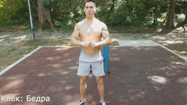 - Застанете прави с разкрач на ширината на раменете и ръце пред тялото (височината на гърдите) или отстрани.