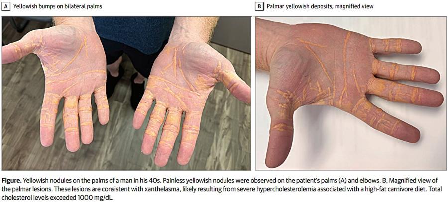 Трима кардиолози - двама от многопрофилната болница „Тампа“ и един от Центъра за ракови заболявания „Андерсън“ към Тексаския университет - съобщават за случай на възрастен мъж, който е получил жълтеникави възли (нодули) по ръцете, краката и лактите си, след като се е подложил на месоядна диета.