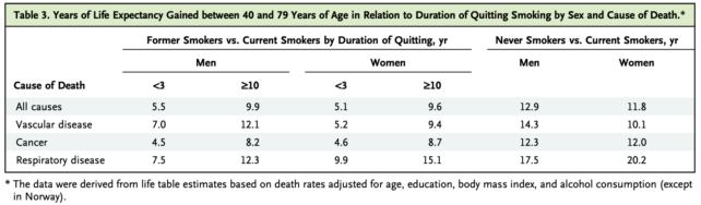 Настоящите констатации се потвърждават от предишни наблюдателни проучвания, в които ползите от отказването от тютюнопушене са свързани със значително подобряване на продължителността на живота, която понякога достига общо до десет години.