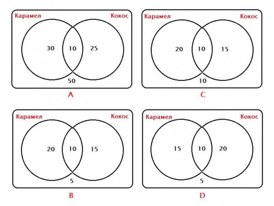 В кутията има 50 шоколадови бонбона. 30 от тях са с пълнеж карамел. 25 - с кокос. 10 са с двоен пълнеж - карамел и кокос, а останалите са просто шоколадови бонбони без пълнеж.