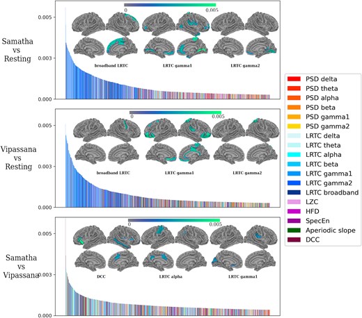 Сравнение на мозъчната активност при различни медитативни методи и в състояние на покой, което показва спектралната мощност (от червено към жълто) в различните честотни диапазони, както и характеристики, свързани с невронната сложност и критичност (в синьо, виолетово и зелено). (Pascarella et al., Neuroscience of Consciousness, 2025)