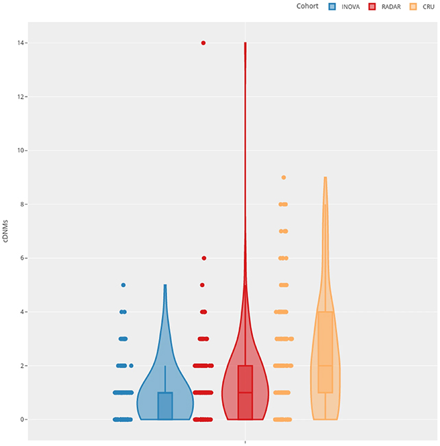 Брой на клъстерираните de novo мутации (cDNM) в контролната група (в синьо), групата на операторите на радар (в червено) и групата от Чернобил (в жълто). (Brand et al., Sci. Rep., 2025)