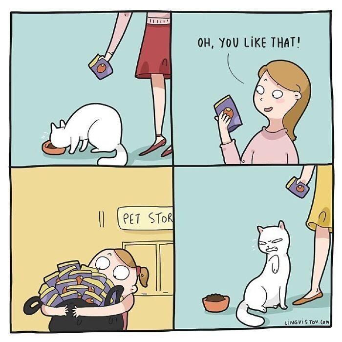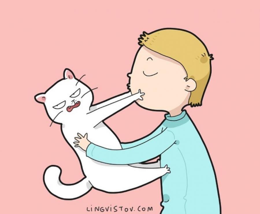 Руската илюстраторка Lingvistov изобразява това по един съвършен начин в своите забавни комикси. Тя ни показва как изглежда животът с котка, бъркотиите, в които животинчето постоянно се забърква, и как то може да промени живота ни.