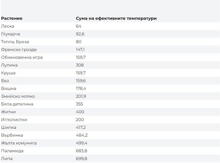 Фиг. 1. Суми на ефективните температури необходими за цъфтеж за различните растения (Източник, наблюдения на автора).