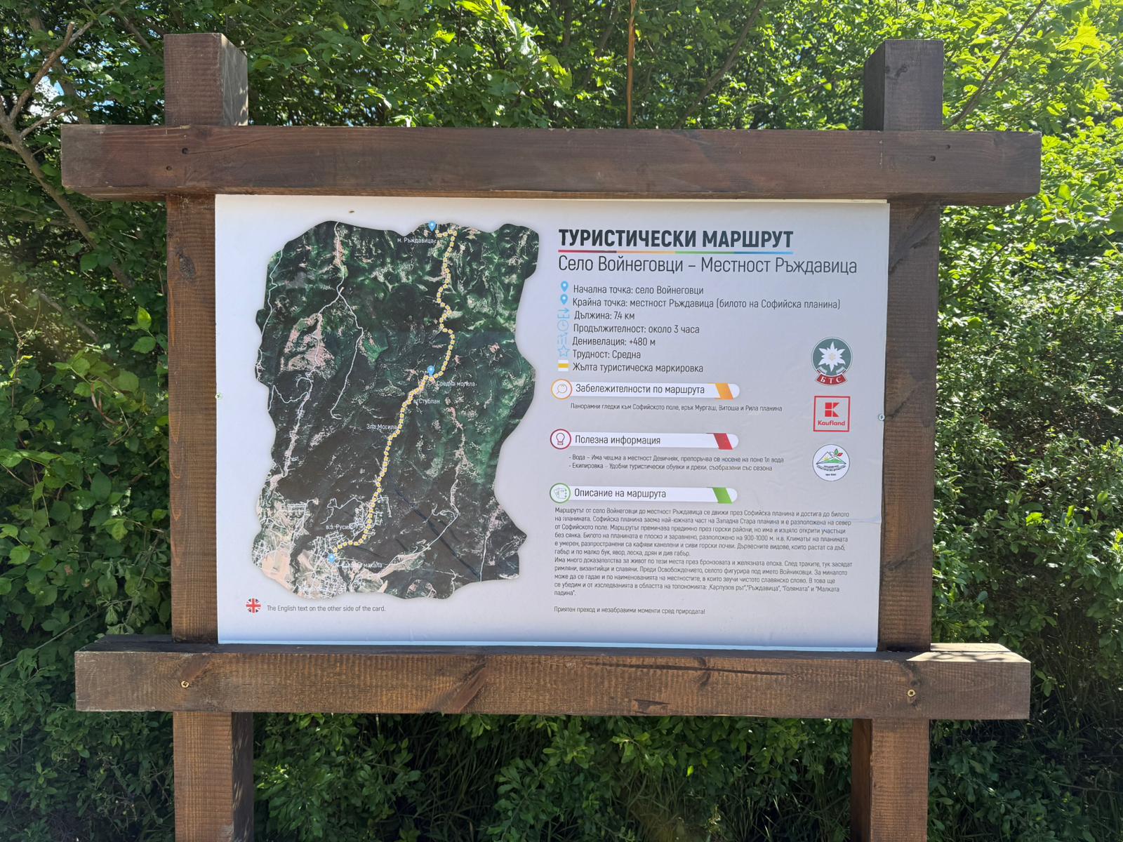 Туристическият маршрут от с. Войнеговци до местност Ръждавица - билото на Софийска планина, вече е с обновена маркировка и подобрена инфраструктура. В рамките на събитието – част от проектът „Не губи посоката“ на Kaufland България и Български туристически съюз (БТС), бе обновена лентовата маркировка по 7,4-километровия маршрут. Участниците в доброволческата акция монтираха ново информационно табло в началото на пътеката в с. Войнеговци, поставиха 15 указателни стрелки по стандартите на БТС и се включиха в дейности по почистване на района около чешмата Момин дол – ключова спирка по маршрута, която предоставя приятна възможност за отдих. Проектът има за цел да бъдат премаркирани над 400 км туристически маршрути в страната до края на 2025 г.