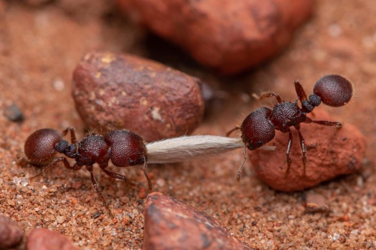 Много видове мравки са важни за разпръскването на семената. На тази снимка виждаме как две работнички от вида Meranoplus носят семе до своето гнездо. Източник: Francois Brassard
