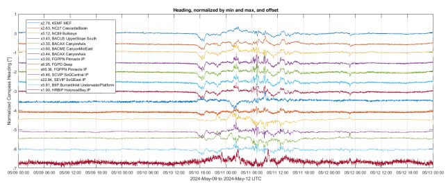 Данните от подводните компаси на ONC между 9 и 12 май показват ясно смущенията по време на слънчевата буря. (ONC)