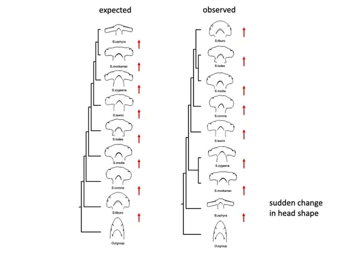 Вляво виждаме очакваната еволюция на акулите чук – с постепенна промяна във формата на главата. Вдясно е моделът на еволюционна промяна, получен след секвенирането на ДНК данни. Източник: Gavin Naylor, CC BY-ND