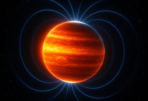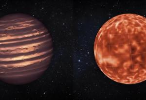 Художествена визуализация на традиционната астрономическа идея, че кафявите джуджета приличат на Юпитер по външен вид, като показват ясно изразени множество зонални ленти и стабилни вихри, подобни на Голямото червено петно. Тази циркулация в стил „Юпитер“ формира основната представа за обяснение на голямоамплитудната променливост на кафявите джуджета. Вдясно – модел на атмосферната циркулация за супер Юпитера VHS 1256B. Източник: NASA/JPL-Caltech