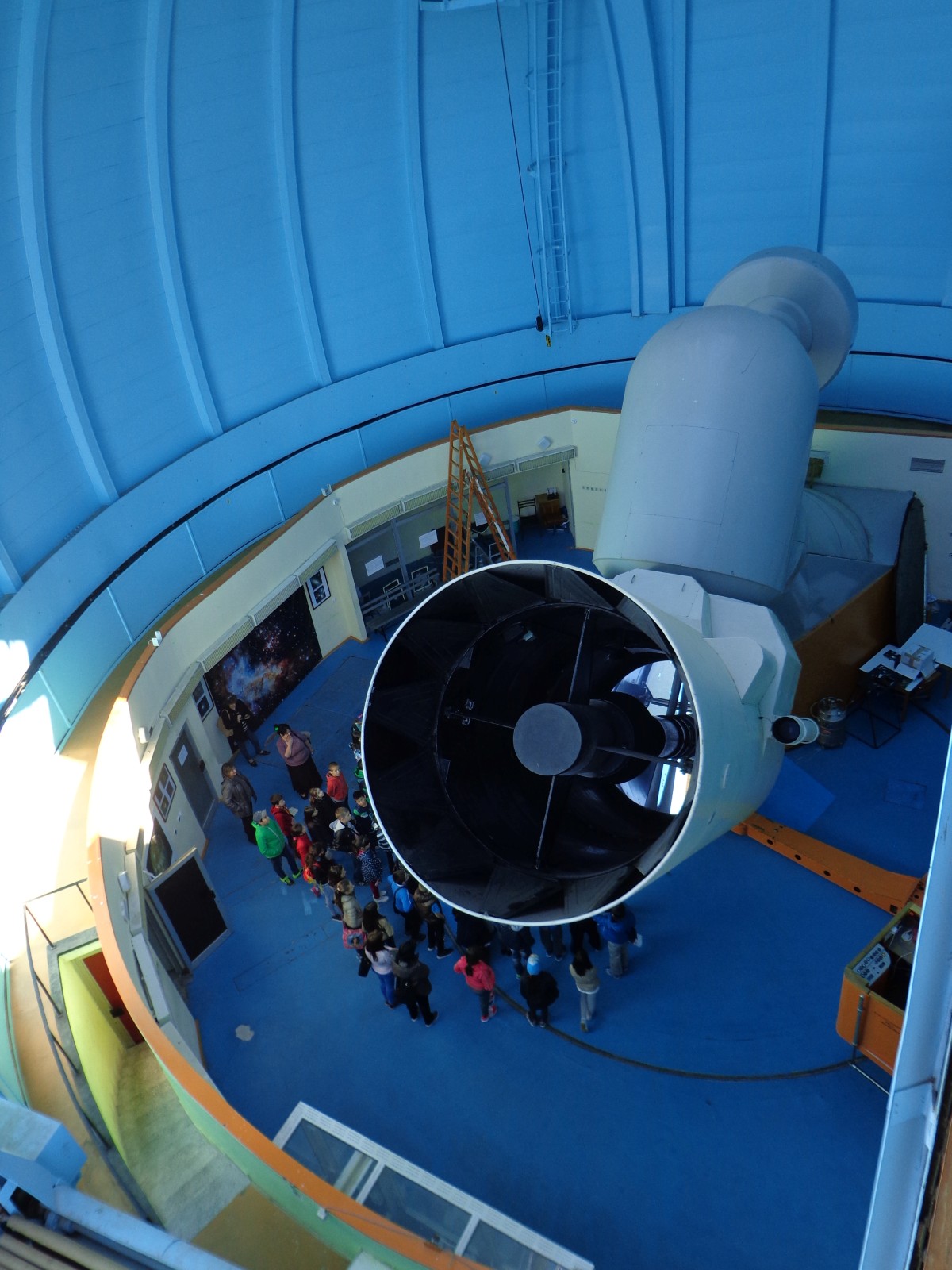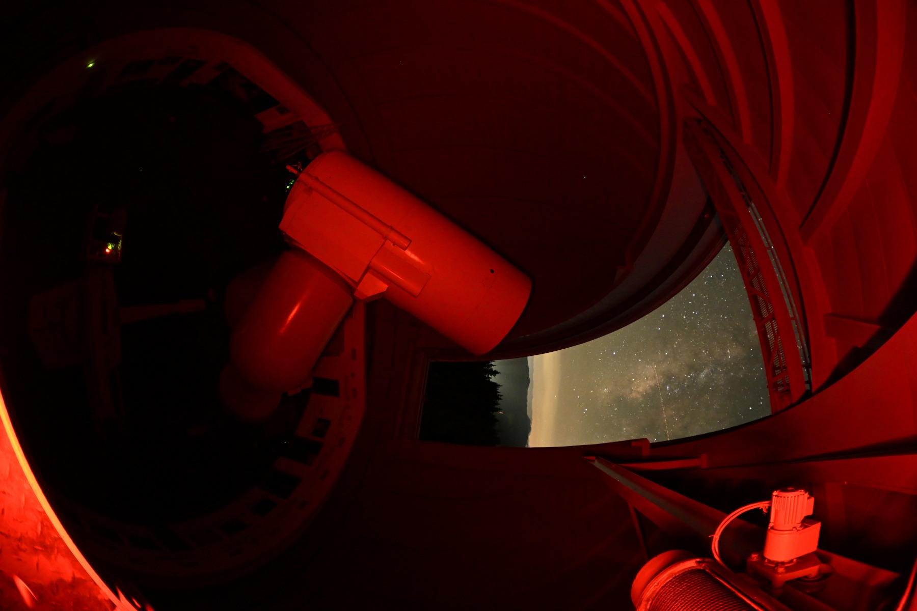 2-метровия телескоп по време на наблюдения. Млечният път се вижда през процепа на кулата на телескопа.