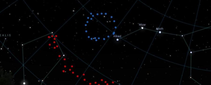 Големият пръстен (синьо) и Гигантската арка (червено). (University of Central Lancashire)