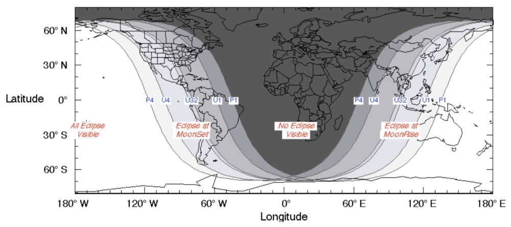 Карта на видимостта на пълното лунно затмнение. Източник: NASA