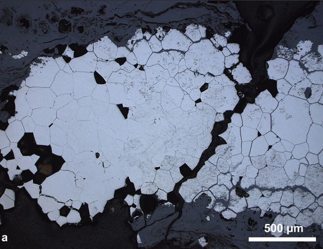 Металлографска микрофотография на проба от артефакта. (Li et al., Archaeol. Res. Asia, 2026)