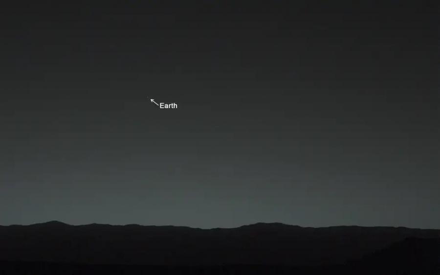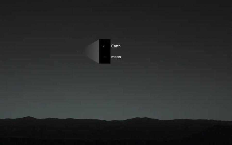 „Кюриосити“ успя да бие постижението на „Спирит“, като включи в своя кадър и Луната. Тази снимка е направена на 31 януари 2014 г. от инструмента Mastcam на марсохода – около 80 минути след залез. По това време Земята е била най-яркият обект на небосвода. Когато фотографията е направена, Червената планета се е намирала на 160 млн. км от нас.