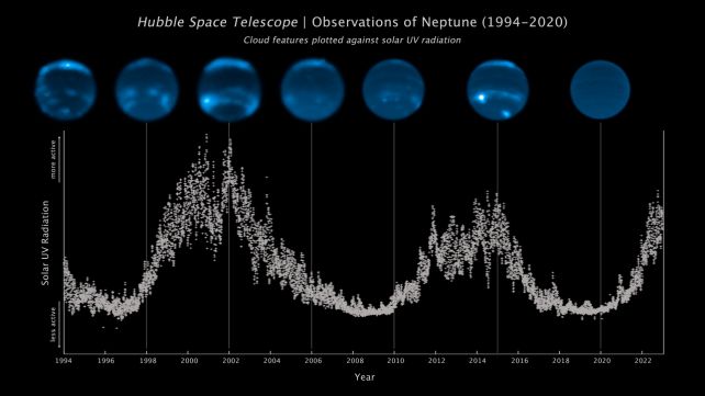 Тези комбинирани набори от данни разкриват, че количеството на облачната покривка на Нептун се колебае в рамките на приблизително 11-годишни цикли, които, изглежда, са синхронизирани със слънчевата активност.