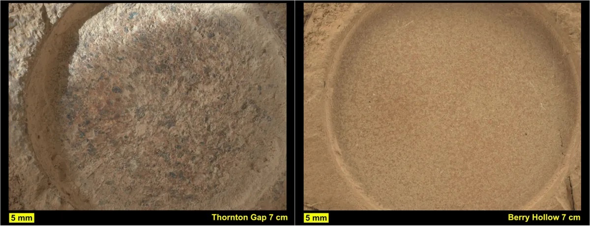 Двете проби – с размера на ученически тебешир – са кръстени Hazeltop и Bearwallow. Те са взети от Wildcat Ridge съответно на 25 юли и 2 август. Източник: NASA/JPL-Caltech/ASU/MSSS